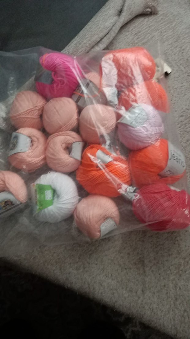 Pembe, turuncu, beyaz ve kırmızı tonlarında çeşitli renklerde el işi iplik topları, şeffaf bir plastik poşette paketlenmiş.