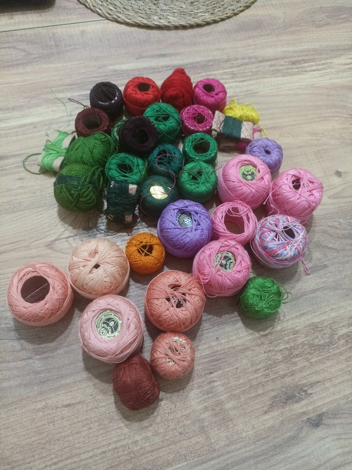 Bohem tarz el işleri için çeşitli renklerde iplik topları. Örgü veya tığ işi projeleri için uygun.