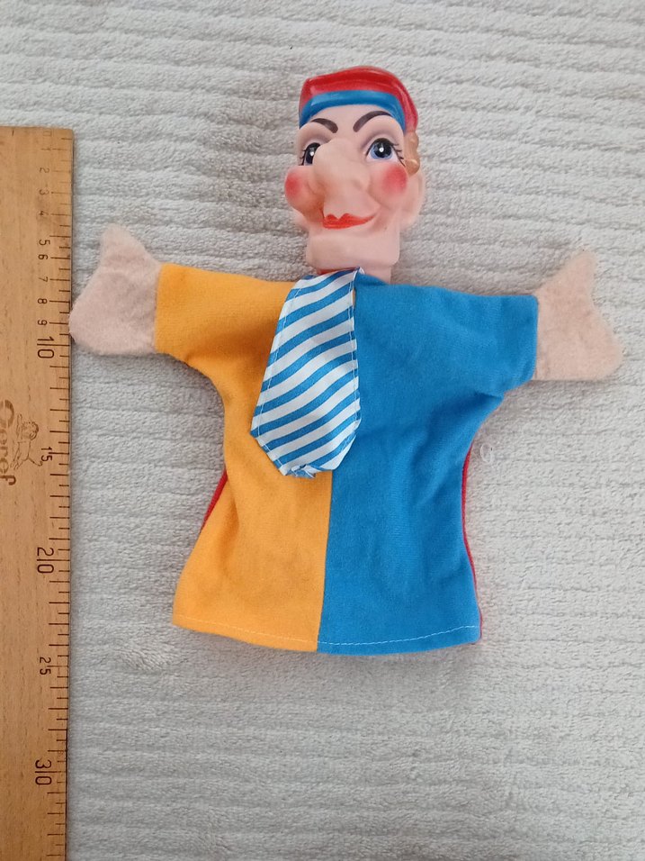 Yumuşak kumaştan yapılmış, sarı ve mavi renkli gövdesi olan, çizgili kravatlı ve detaylı plastik yüzlü renkli parmak kuklası. Yaklaşık 25 cm boyundadır.
