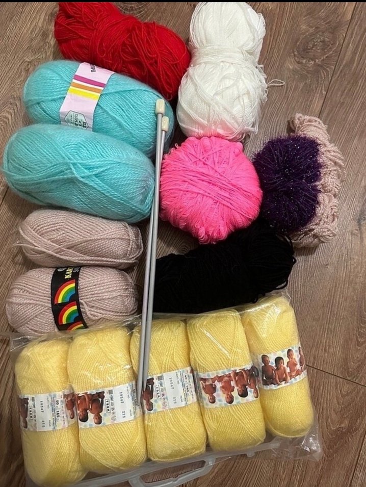 Kırmızı, beyaz, turkuaz, pembe, siyah ve sarı renklerde çeşitli el örgü iplikleri ve bir tığ içeren renkli set. Bohem tarz el işleri için uygundur.