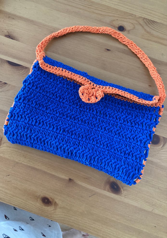 El örmesi trabzan tasarımlı, mavi gövde ve turuncu saplı renkli kadın çantası. Minimalist ve desensiz yapısıyla günlük kullanıma uygundur. Marka temsilidir…