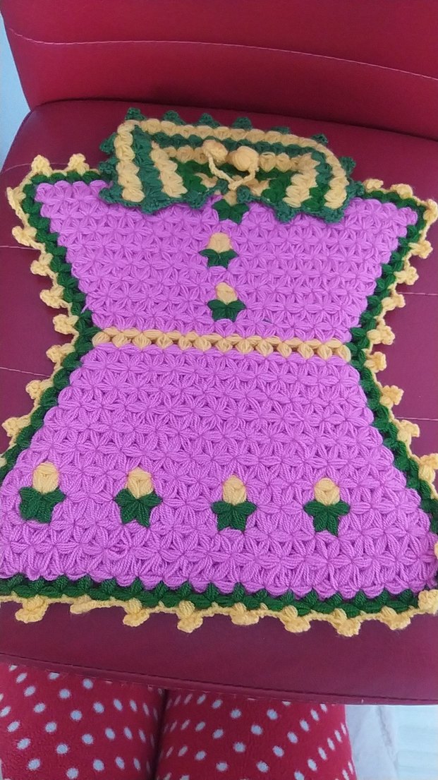 Mor, yeşil ve sarı renklerde el örgüsü, elbise şeklinde detaylı banyo süngeri.