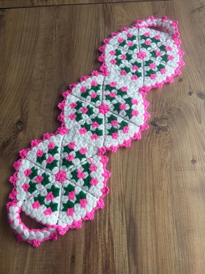 Pembe, yeşil ve beyaz iplerle el örgüsü yapılmış renkli banyo lifi . Nazikçe peeling yapmak için uygundur.
