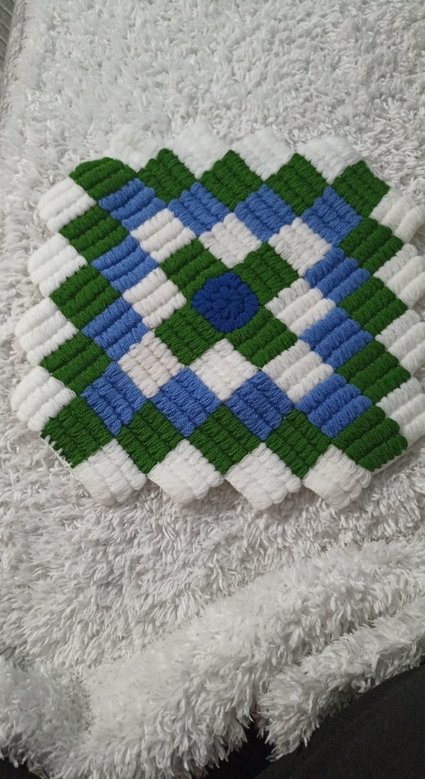 Yeşil, mavi ve beyaz tonlarda, yumuşak dokulu renkli el örgüsü banyo süngeri. Nazik temizlik için uygundur.