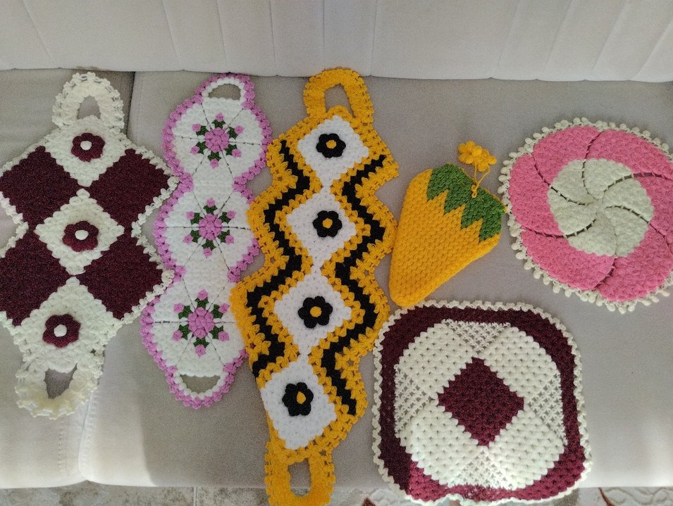 Yumuşak iplikten yapılmış, çeşitli desen ve şekillerde renkli el örgüsü banyo süngerleri.