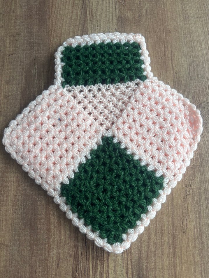 Yumuşak pastel ve koyu yeşil tonların birleştiği dokulu, renkli el örgüsü banyo süngeri.