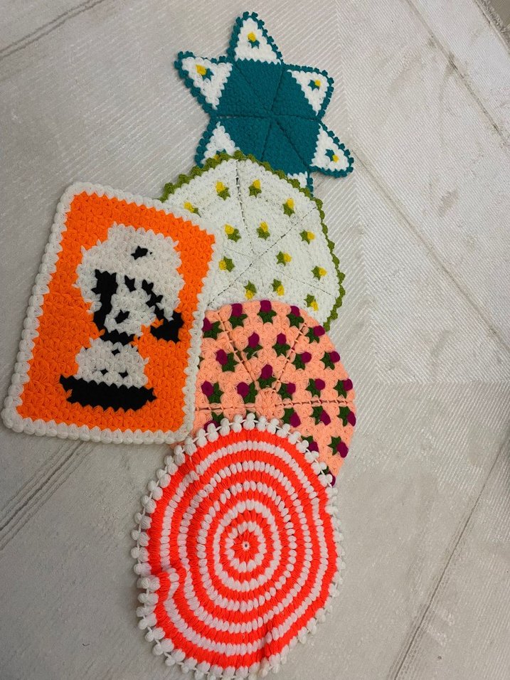 Çeşitli şekil ve desenlerde, renkli el örgüsü banyo lif seti. Toplamda 5 tane.