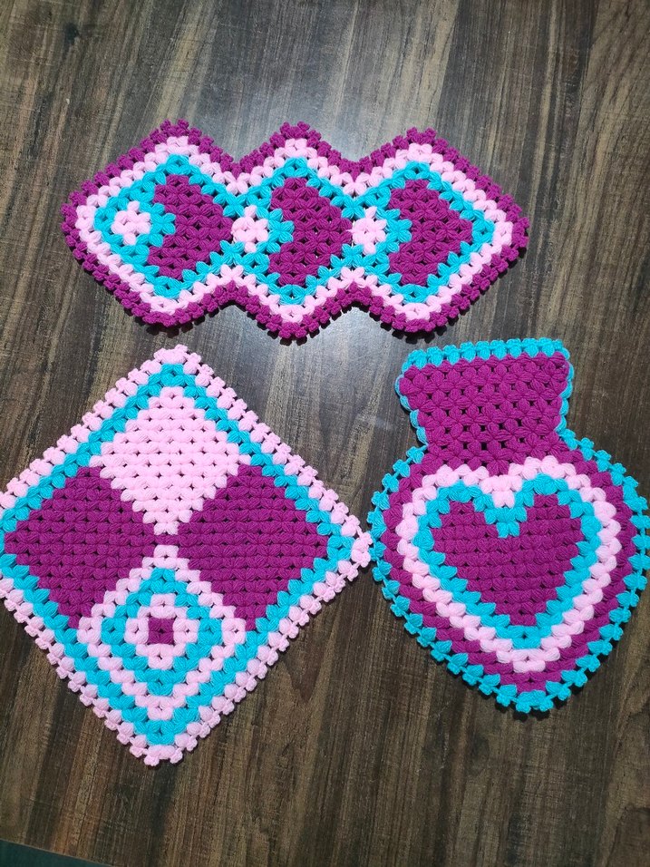 Mor, pembe ve mavi tonlarında yumuşak iplikle el örmesi, geometrik ve kalp desenli renkli banyo lifleri