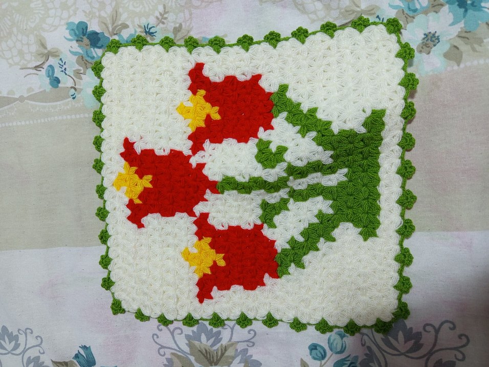 Bu renkli banyo süngeri, beyaz zemin üzerinde kırmızı, sarı ve yeşil çiçek desenleriyle el örgüsü olarak tasarlanmıştır.