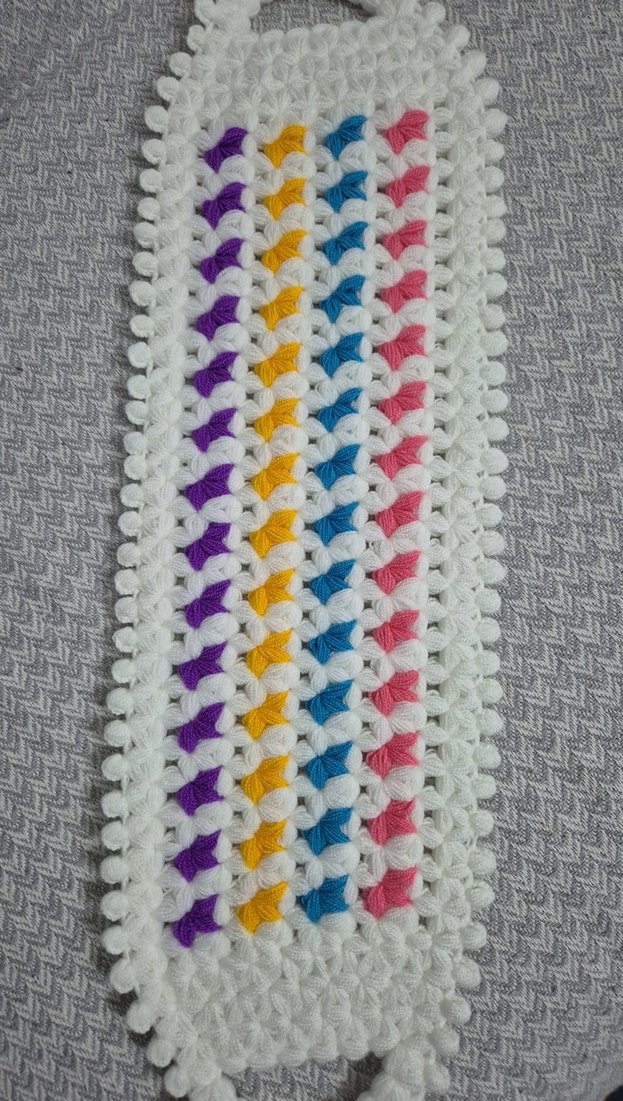 Yumuşak dokulu, renkli el örgüsü banyo süngeri, nazik temizlik için ponpon detaylı kenarlarla.