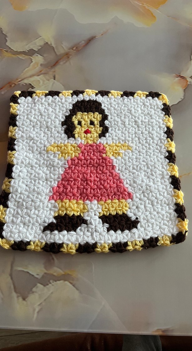 Kırmızı elbiseli kız figürlü, el örgüsü renkli banyo süngeri. Yumuşak dokusu ile nazik temizlik sağlar.