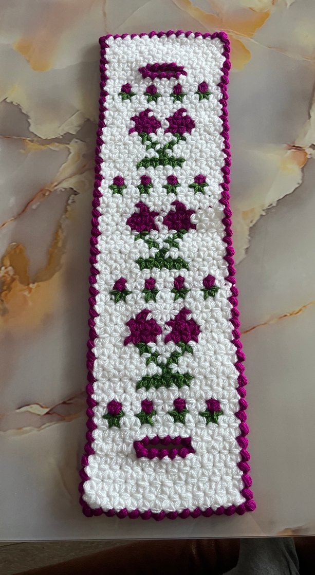 Çiçek desenli, dokulu yüzeye sahip renkli el örgüsü banyo süngeri.