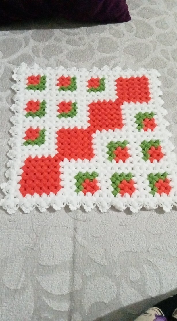 Kırmızı, yeşil ve beyaz renklerde çiçek desenli, el örgüsü renkli banyo süngeri. Yumuşak ve dekoratif.