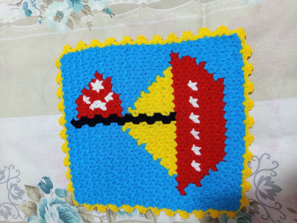 Kırmızı, sarı, mavi, siyah ve beyaz renklerde canlı üçgen desenli, el örgüsü renkli banyo süngeri .