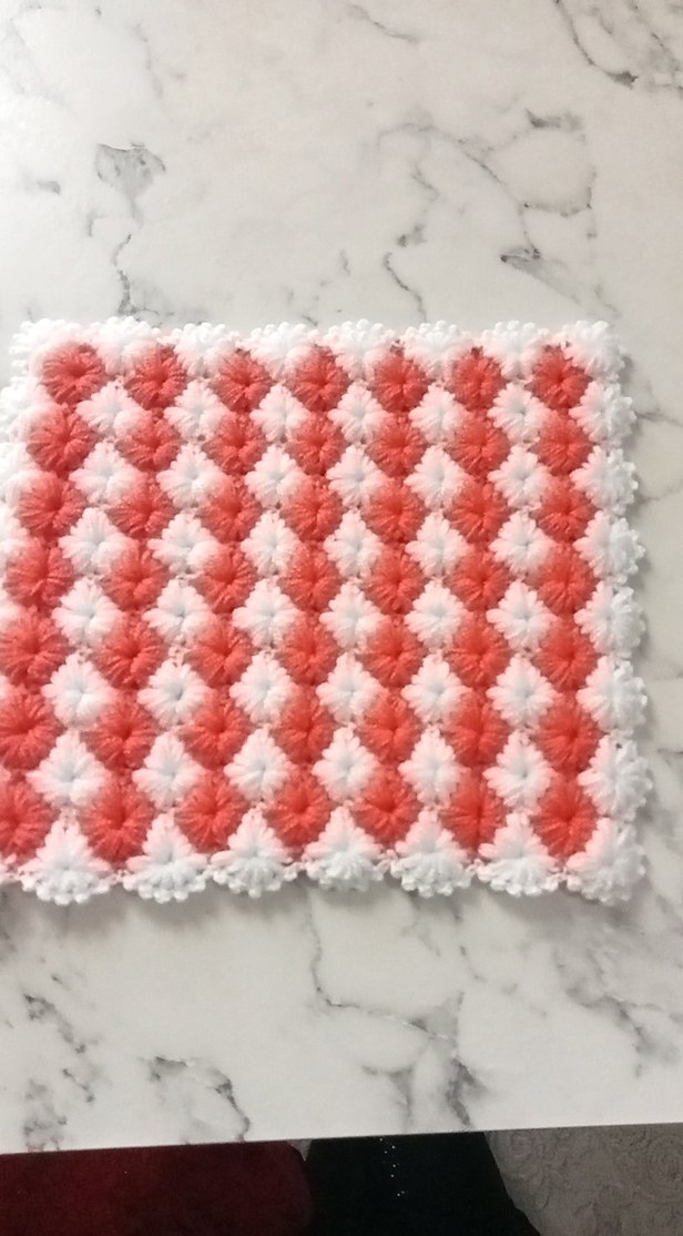 Kırmızı ve beyaz tonlarda dokulu, renkli el örgüsü banyo süngeri. Yumuşak ve dekoratif kullanım sağlar.
