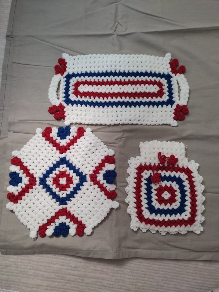 Kırmızı, mavi ve beyaz desenlere sahip renkli el örgüsü banyo süngerleri seti, farklı şekillerde kullanıma uygun. El yapımı, sıfır ürün