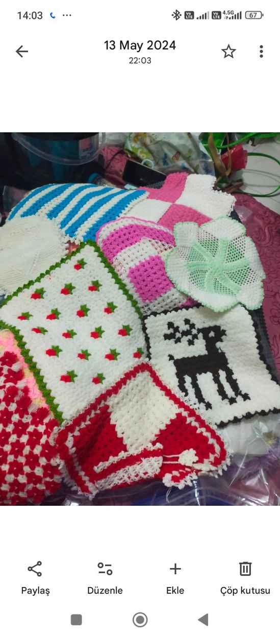 Çizgili, çiçekli ve geyik desenli çeşitli renklerde el örgüsü yumuşak banyo süngerleri seti. Nazik temizleme için idealdir.