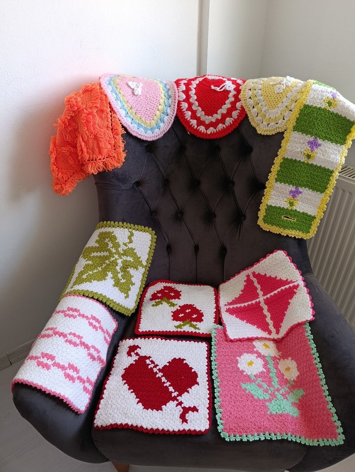 Çiçek ve kalp desenli, renkli el örgüsü banyo süngerleri seti. Yumuşak ve dekoratif, banyo için uygundur. tane fiyatı çoklu alımda indirim olur