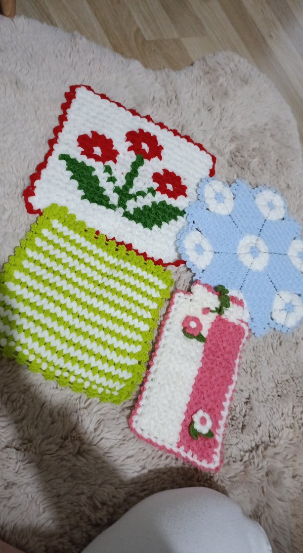 4 adet fiyatıdır. Çiçek ve geometrik desenlere sahip renkli el örgüsü banyo süngerleri, nazik temizlik ve dekoratif görünüm sunar. hiç kullanılmadı