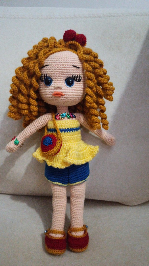 Kıvırcık saçlı, sarı elbise ve mavi şortlu, omuz çantalı renkli el örgüsü bebek. Detaylı tığ işi ile yapılmıştır.