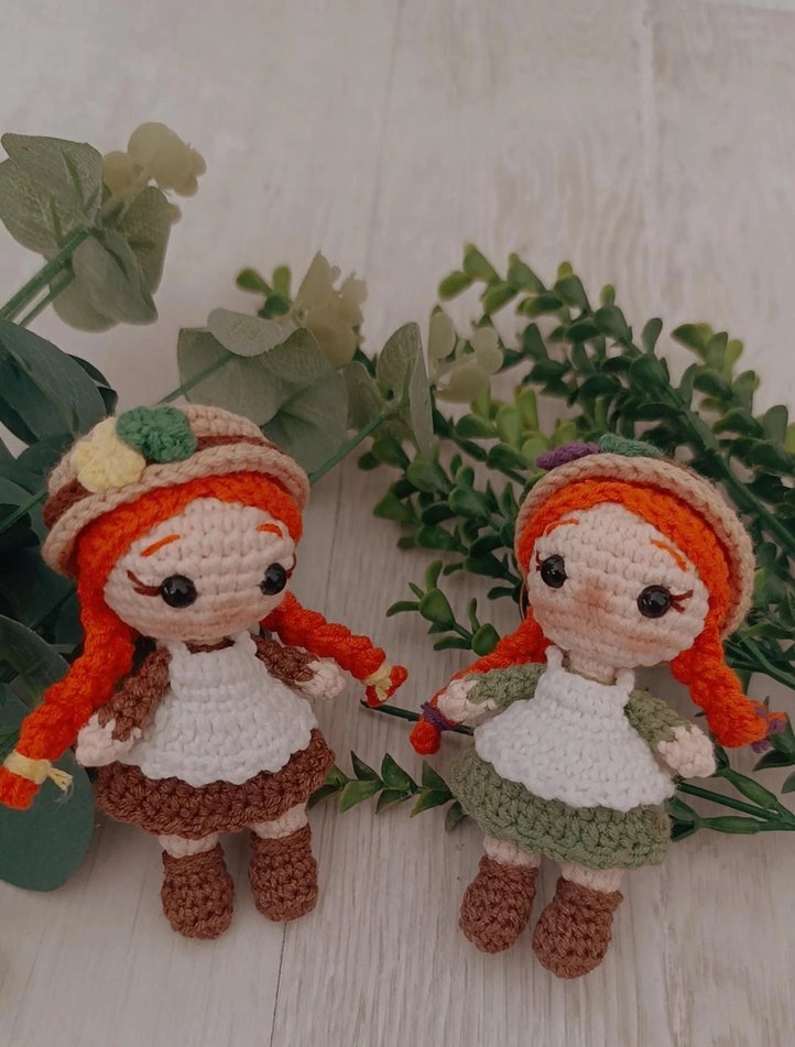 Turuncu saçlı, detaylı kıyafetli iki renkli el örgüsü bebek. Koleksiyon veya hediye için uygun.