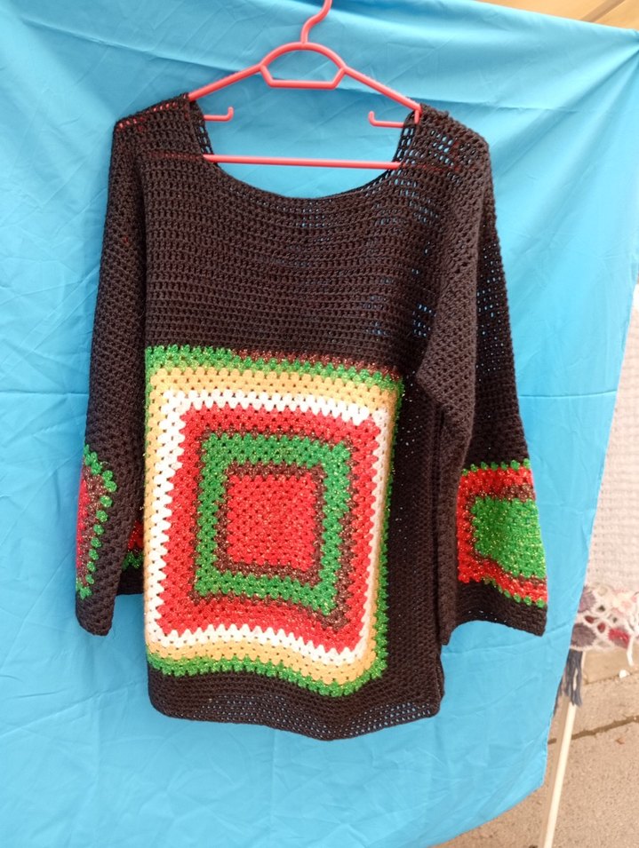 Renkli, uzun kollu ve yuvarlak yakalı, bol kesim el örgüsü kazak. Canlı renklerde desenli kareler bohem tarzı yansıtıyor.