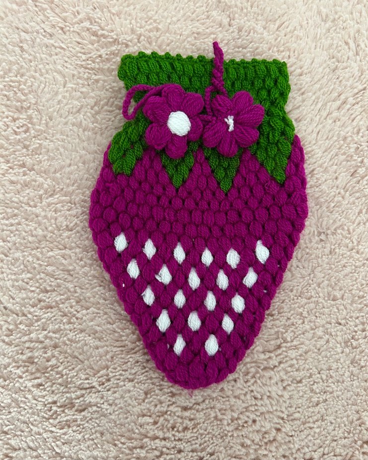 Yeşil yapraklar ve süs çiçekleriyle renkli, el örgüsü çilek şeklinde banyo süngeri. Ürün hiç kullanılmamıştır