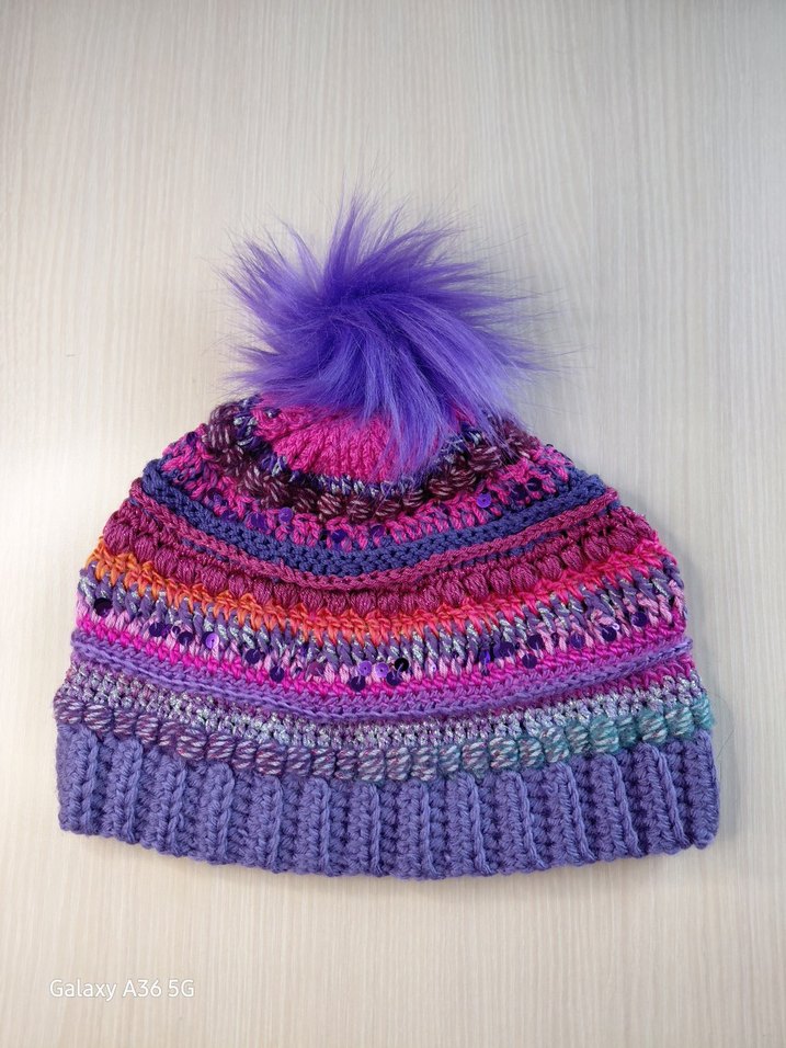 Renkli çizgili, örgü kadın bere, mor ponponlu ve bohem tarzda rahat bir görünüm sunar. Retro dokunuşlu, sıcak tutan bir modeldir. ❄️
