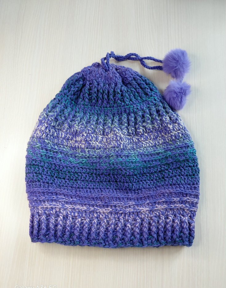 Renkli mor örgü kadın bere, ponpon detaylı, bohem ve retro tarzına uygun, rahat bir yapıya sahiptir.