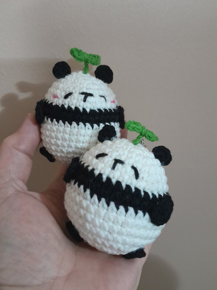 Beyaz ve siyah renklerde, yeşil filiz detaylı yumuşak el örgüsü panda peluş oyuncaklar. Sevimli ve renkli el yapımı tasarım.
