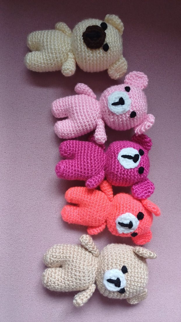 Yumuşak dokulu, çeşitli renklerde el örgüsü renkli peluş ayıcıklar. Her ayıcık detaylı yüz nakışına sahip.