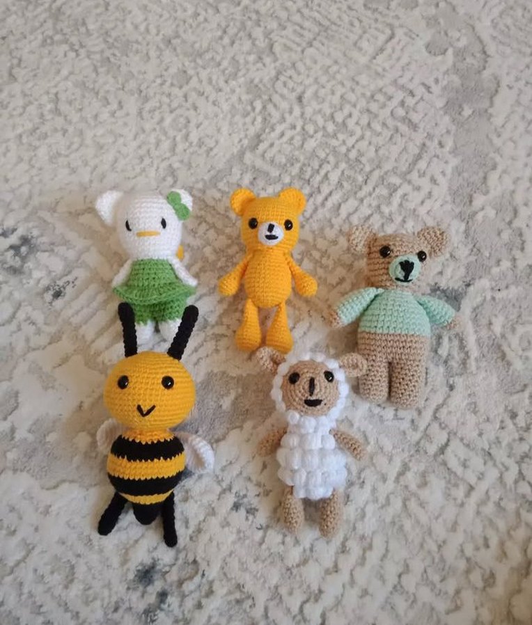 Yumuşak iplikten yapılmış, çeşitli hayvan figürlerinde renkli el örgüsü peluş oyuncak seti.