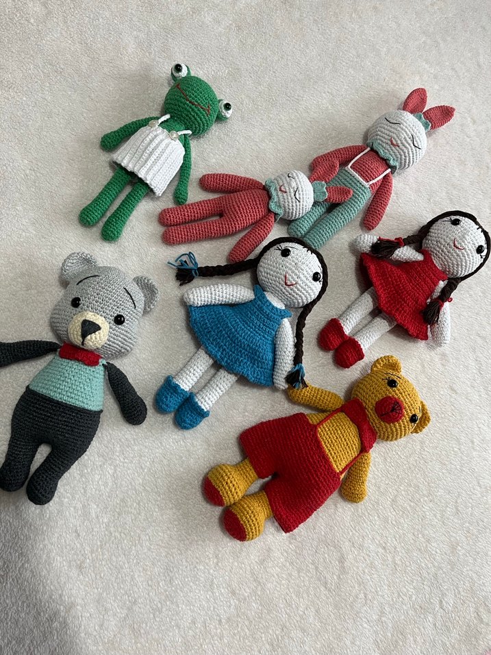 Çeşitli hayvan ve bebek tasarımlarına sahip renkli el örgüsü peluş oyuncaklar. Yumuşak ve detaylı örme yapıda. Hepsi yeni örülmüş kargoya hazır oyuncaklardır toplu uygun fıyata satıstadır ihtıyacı olan dönüş yapsın sormadan alım yapmayınız