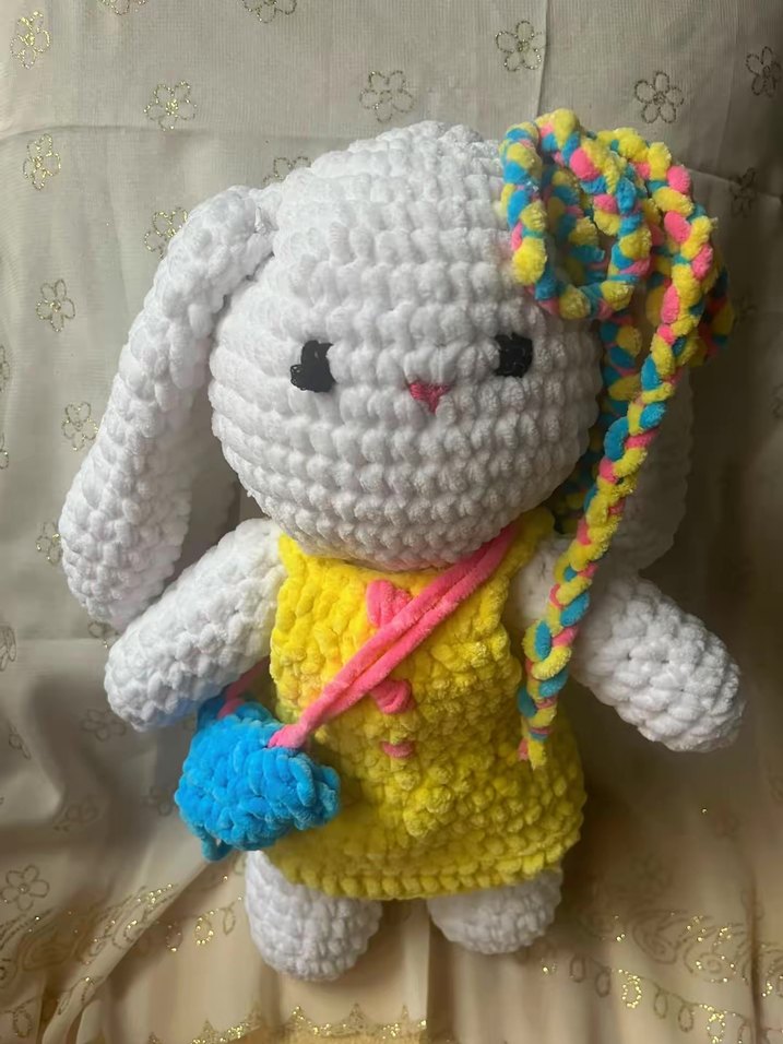 Yumuşak dokulu, sarı elbiseli, mavi çantalı ve renkli kurdeleli el örgüsü tavşan oyuncak. Annem kendi örüyor istediğini renk ve figür de örebilir