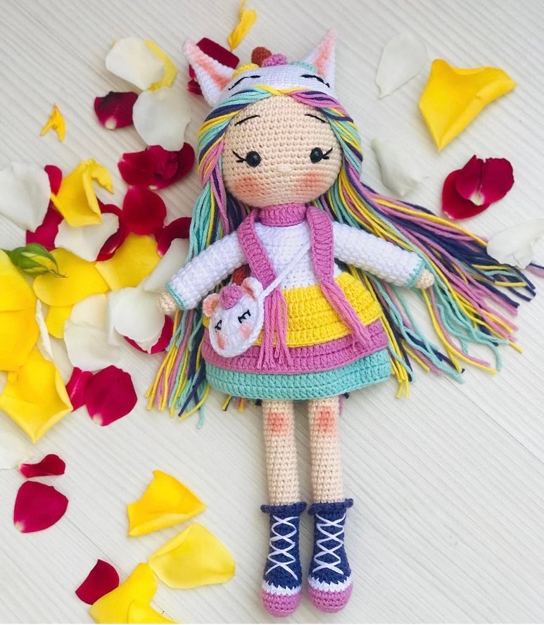 Uzun çok renkli saçlı, unicorn boynuzlu ve küçük unicorn çantası olan pastel renklerde el örgüsü bebek. Etek ve bağcıklı botlar içerir.