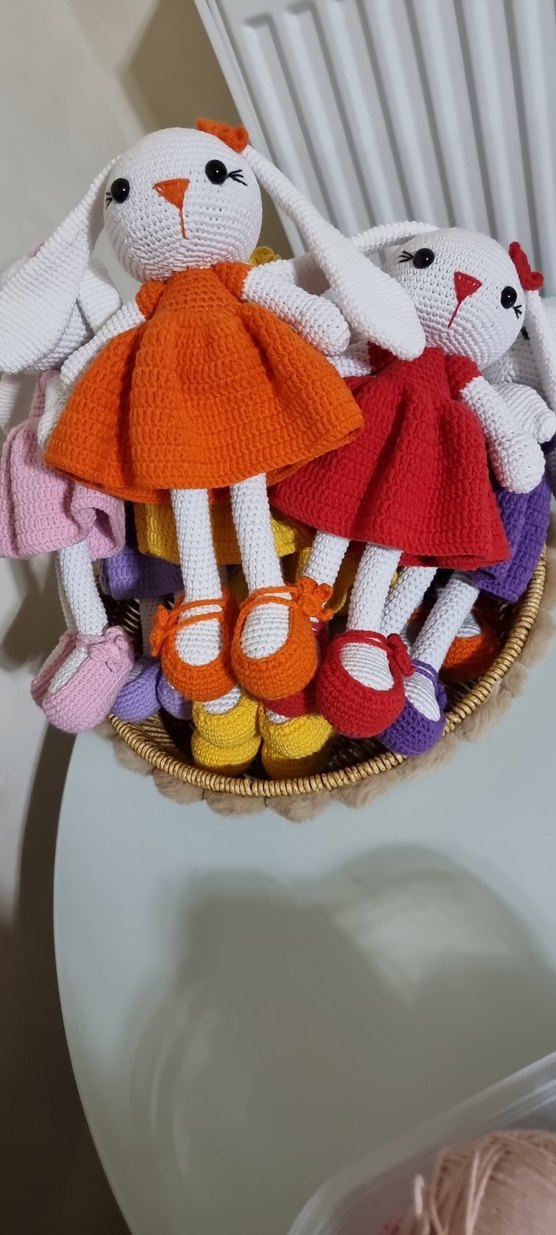 Canlı el örgüsü tavşan bebekler, renkli elbiseler ve uyumlu ayakkabılarla. Yumuşak ve detaylı işçilikli oyuncaklar.