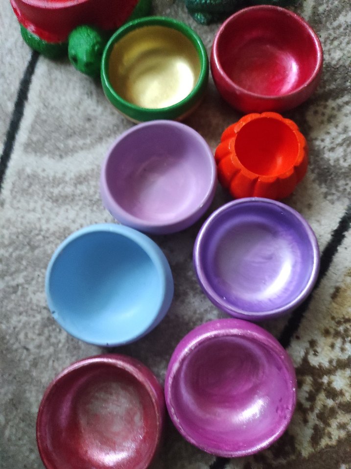 Parlak yüzeyli, çeşitli canlı renklerde el boyaması ahşap kaseler. Dekoratif veya küçük eşya saklama için uygun.