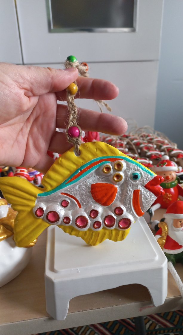 Canlı renklerde el yapımı balık duvar süsü, ipli asma aparatıyla dekorasyonunuza neşeli bir dokunuş katar.