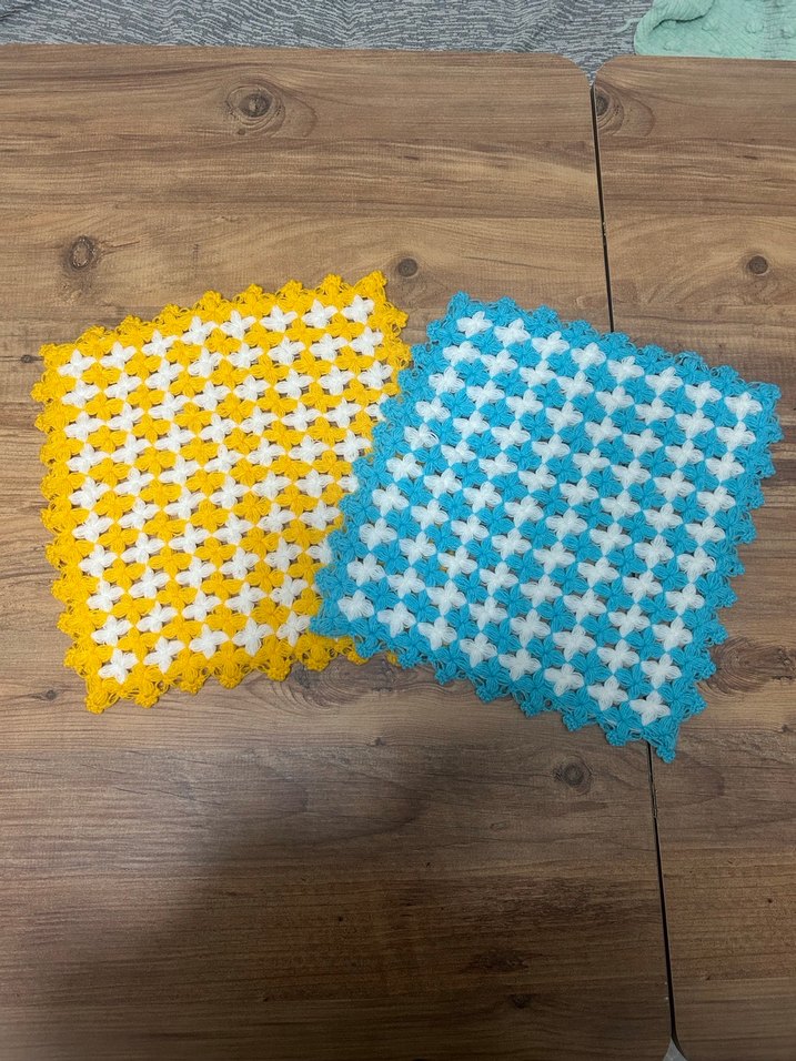 Sarı ve mavi tonlarda desenli, renkli iki adet banyo süngeri. Canlı ve kullanışlı bir banyo seçeneği sunar. #ceyiz #lif #örgü #ceyizlifi
