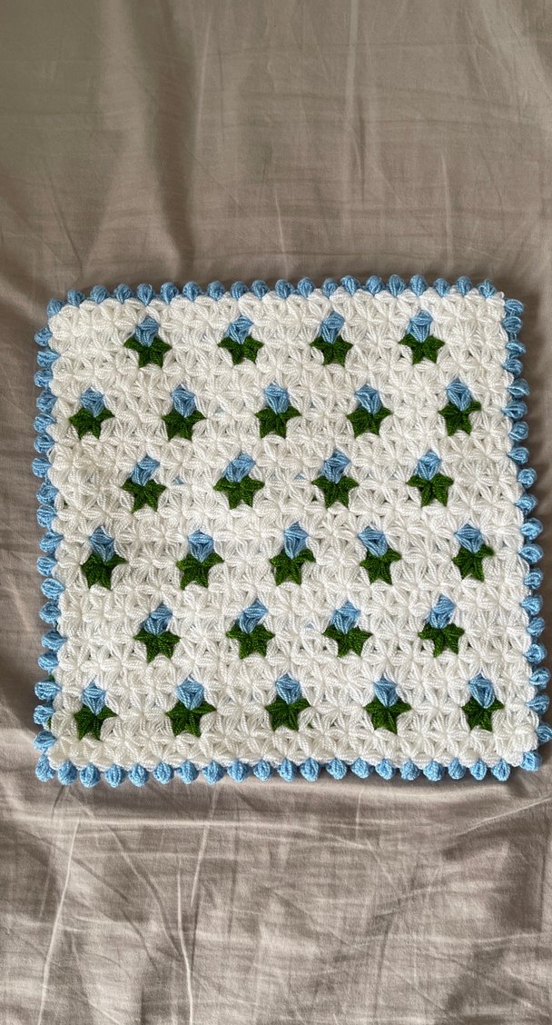 Beyaz zemin üzerine mavi ve yeşil detaylarla süslenmiş, mavi kenarlıklı renkli el yapımı banyo lifi.