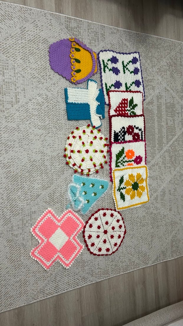 Çeşitli şekil ve desenlerde, canlı renkli ipliklerden yapılmış el yapımı renkli banyo lifleri. 11 adet fiyatıdır. Tane fiyatı 370 tl rica ediyorum el emeğini düşünün, normalde 4070 tl yapıyor alacak olanlar ona göre düşünsün lütfen. Kendi indirimimi ekledim.
