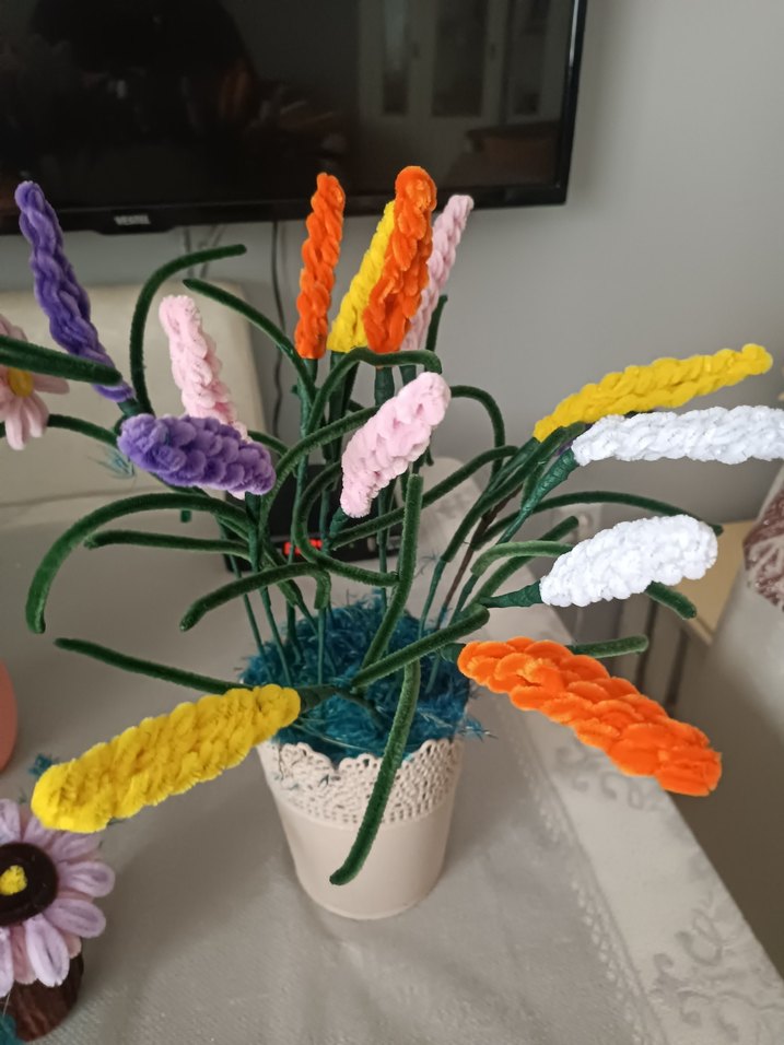 El yapımı, renkli örgülü çiçekler ve yeşil saplarla süslü, dantelli beyaz saksıda bohem çiçek aranjmanı.