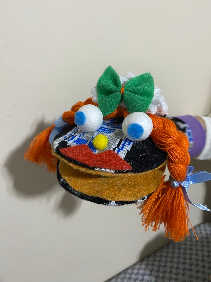 Büyük gözlü, turuncu örgülü saçlı ve yeşil kurdeleli renkli el yapımı bebek. Canlı kumaş detayları ve eğlenceli bir ifadeye sahip.