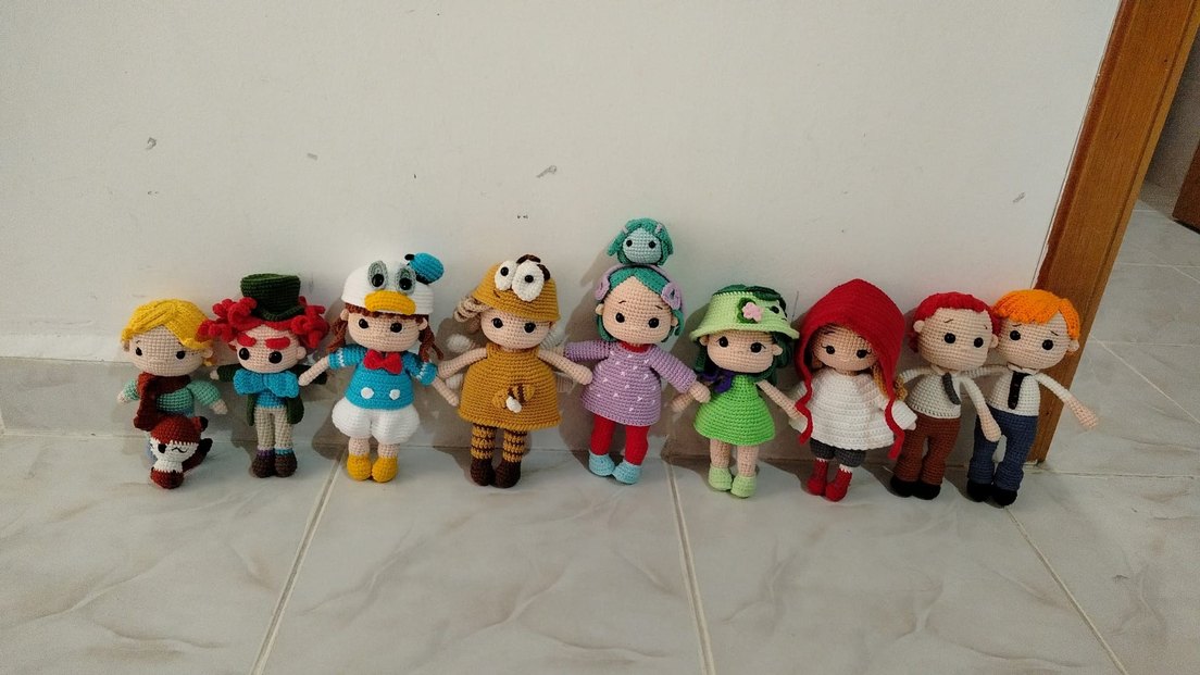 Farklı karakterlere sahip, detaylı kıyafet ve aksesuarlı renkli el yapımı örgü bebek seti. [Tane fiyatıdır.]