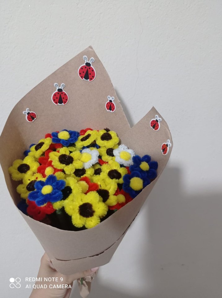 Yumuşak malzemelerden yapılmış, sarı, mavi, kırmızı ve beyaz renklerde el yapımı pop kültür temalı renkli çiçek demeti.isteğe bağlı tek renk de yapılmaktadır.