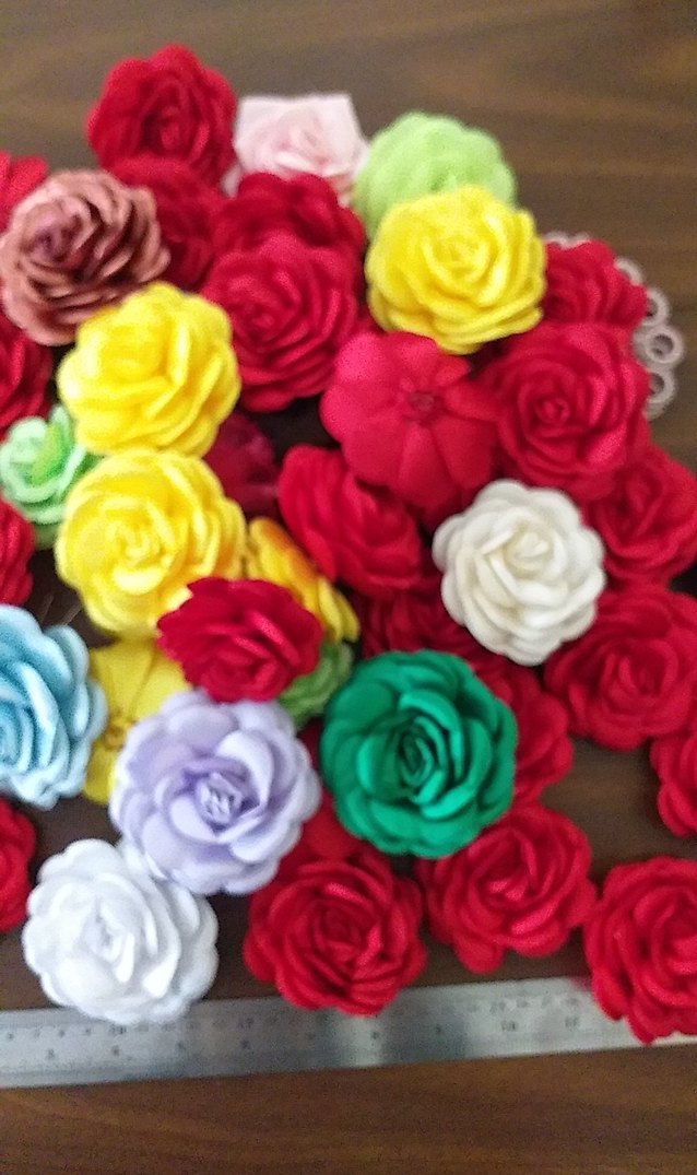 Kırmızı, sarı, yeşil, beyaz ve mor gibi çeşitli renklere sahip el yapımı dekoratif çiçekler. saten kumaş, farklı tutturma aparatlari var, her türlü süsleme için kullanılabilir. broş olarak hazır olanlarda var, adet 20 tl, 6-8 cm arası