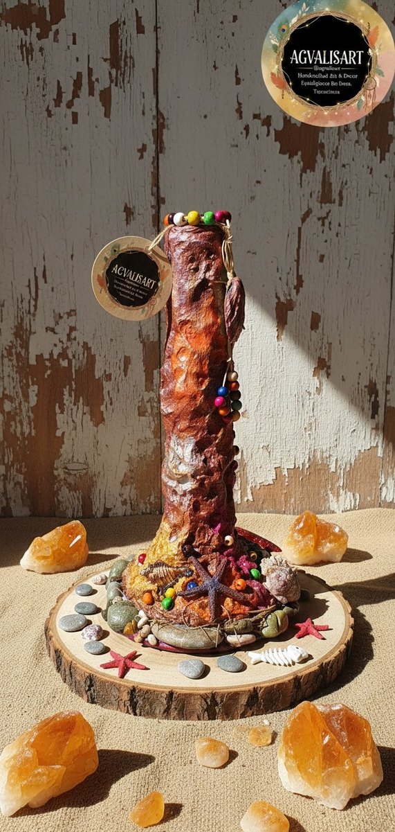 Renkli boncuklar ve küçük deniz temalı süslerle dekore edilmiş, taş ve denizyıldızlarıyla .dekoratif tek ürün el yapımıdır, tek ürün tamamen tasarım ürünüdür, doğal taş ve deniz kabukları ile tasarlandı vazo el işçiliğiyle tasarlandı#handmadeart#dekorasyon#bohem#elektik#