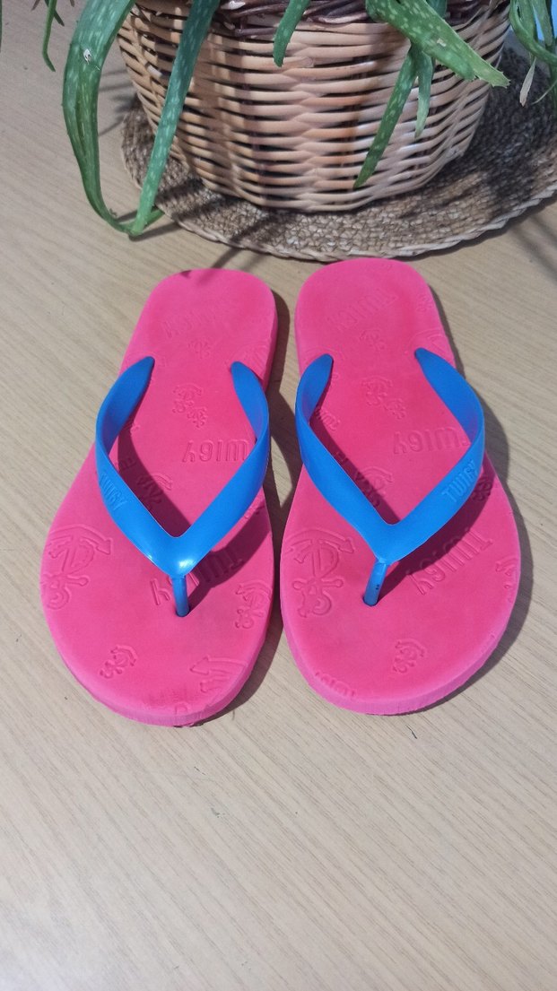 Renkli, pembe tabanlı ve mavi elastik bantlı erkek terlik. Plaj kullanımı için uygun, rahat ve konvansiyonel tarzda. 42 numara giyen birisine olur. resimdeki gibidir.