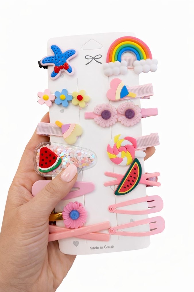 Elastik tokalar ve bantlardan oluşan bu renkli set, çiçek, meyve ve eğlenceli pop kültür desenleri içerir. Çin'de üretilmiştir.