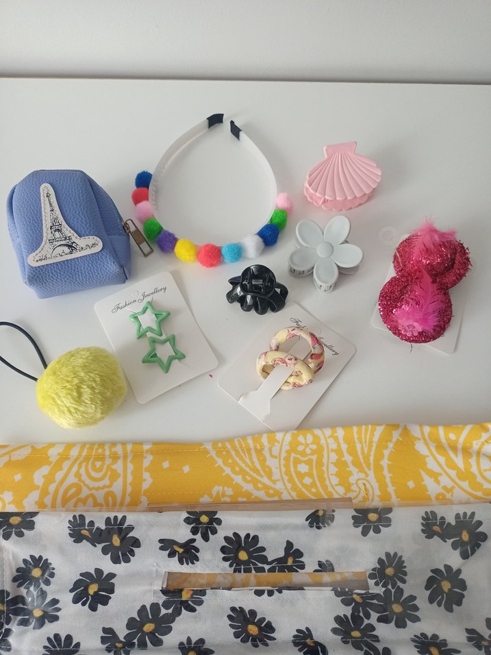 Renkli elastik saç bantları ve tokalar içeren çocuk aksesuar seti, yıldız, çiçek ve ponpon gibi eğlenceli şekillere sahiptir.